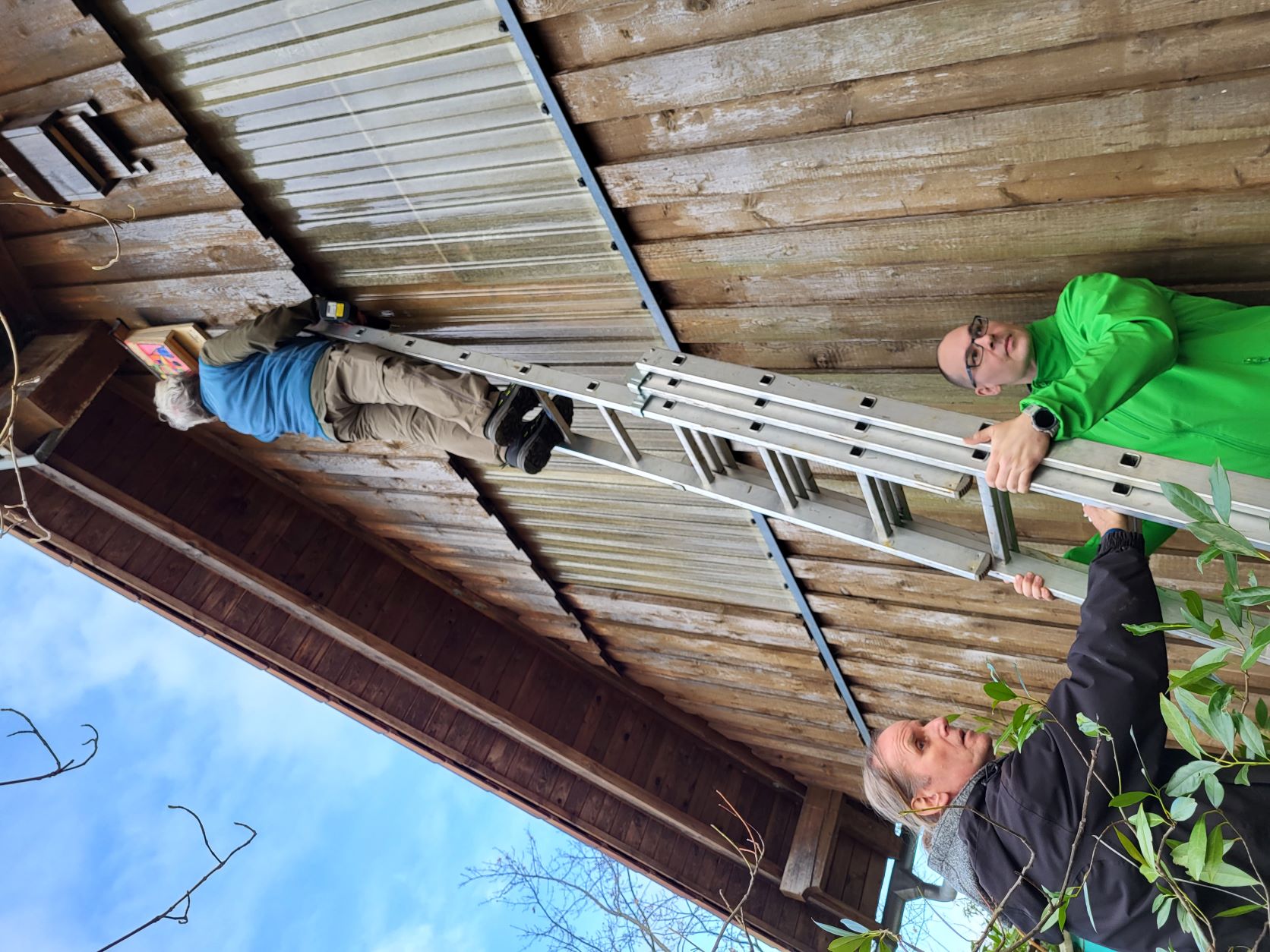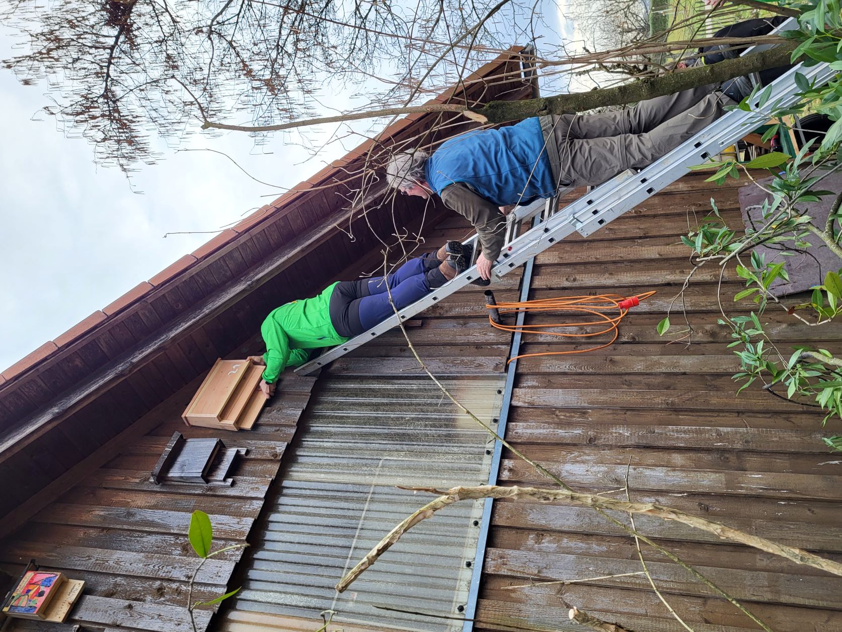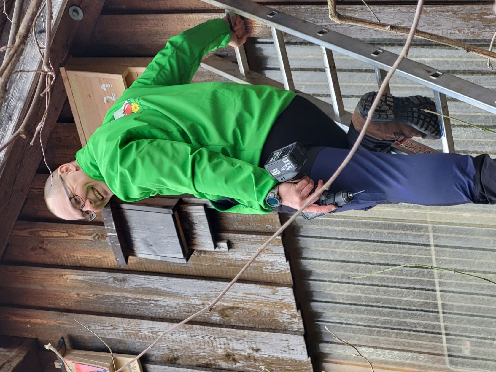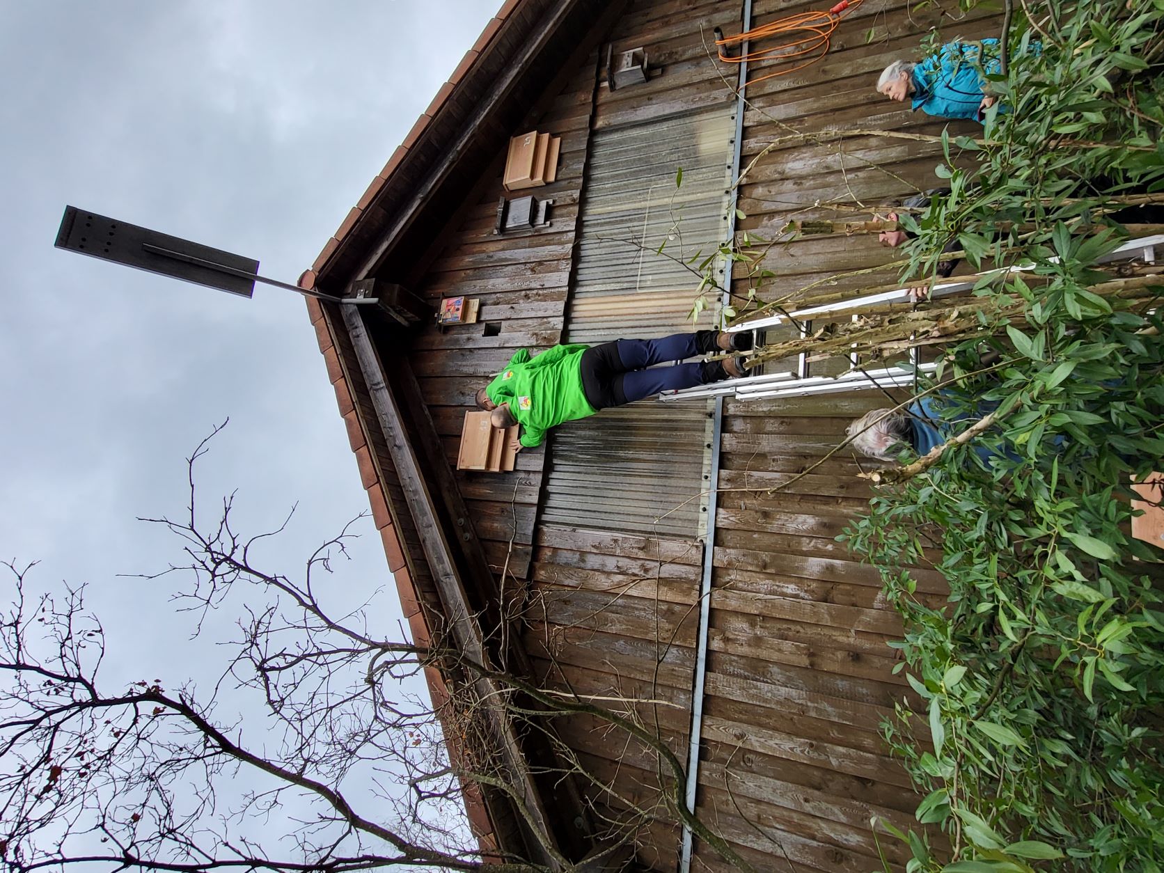 Nach dem die fleißigen Mitglieder des NABU Fellbach bereits 18 Fledermauskästen am Tennhof aufgehängt hatten, wurden die letzten vier Kästen gemeinsam mit dem OGV an der Obstbauscheuer befestigt.