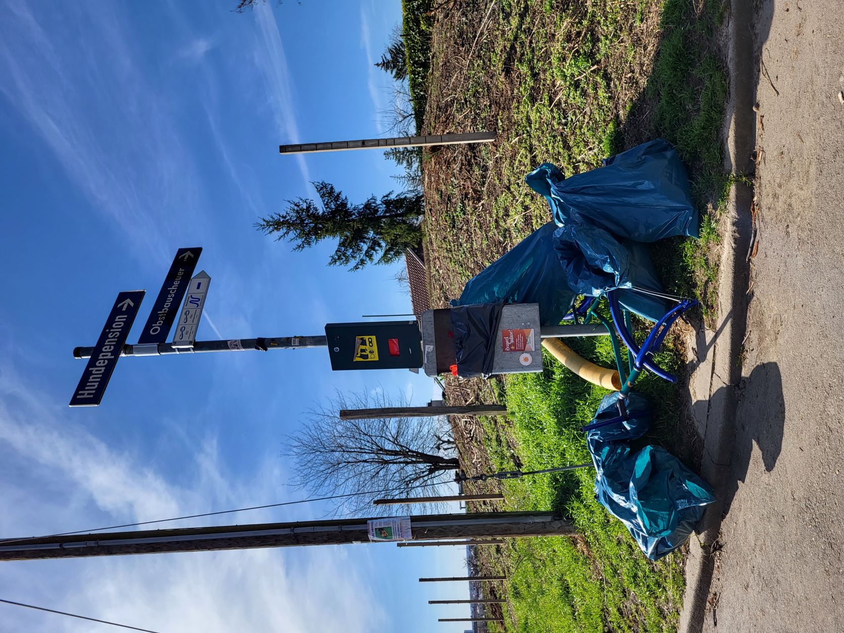 Unser Weg führte uns von Oeffingen, über Tennhof und Sportplatz, zur Obstbauscheuer. Dabei wurden wir vor allem entlang der Landstraße fündig und entdeckten neben viel Zigarettenkippen, Plastiktüten und -flaschen auch ein altes Fahrrad, das achtlos in einem Gebüsch entsorgt worden war.