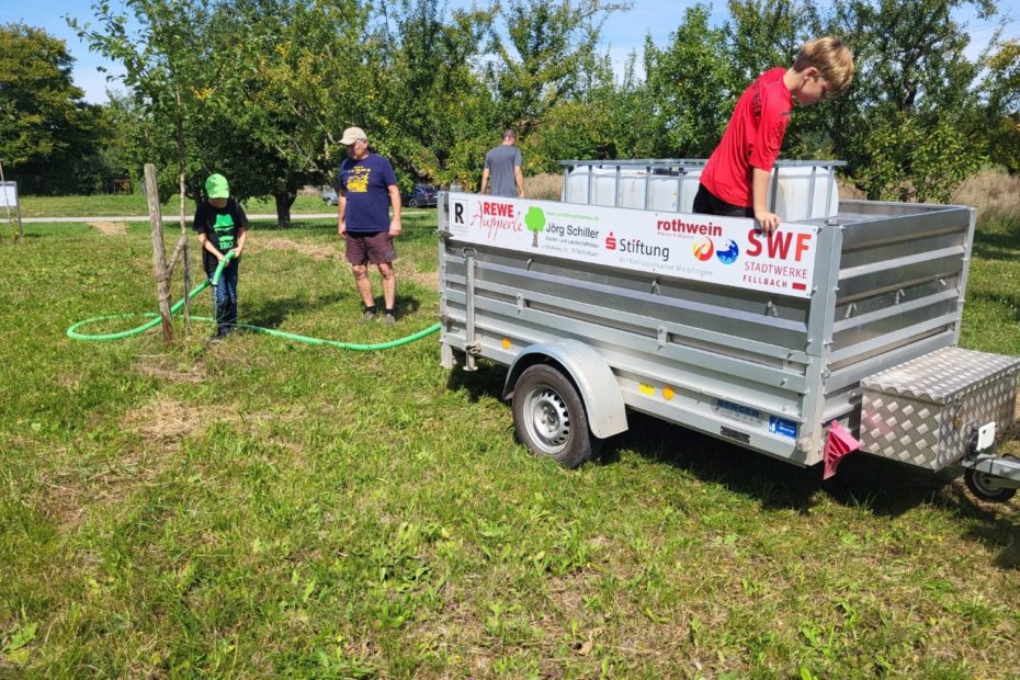 So wurde zusammen der Tank auf den Anhänger gehievt, der Schlauch angeschlossen, der Tank befüllt und los ging die wilde Fahrt zu den Projektwiesen. Auch dort waren die Kids ein eingespieltes Team und gossen mit dem Schlauch direkt vom Traktor aus.